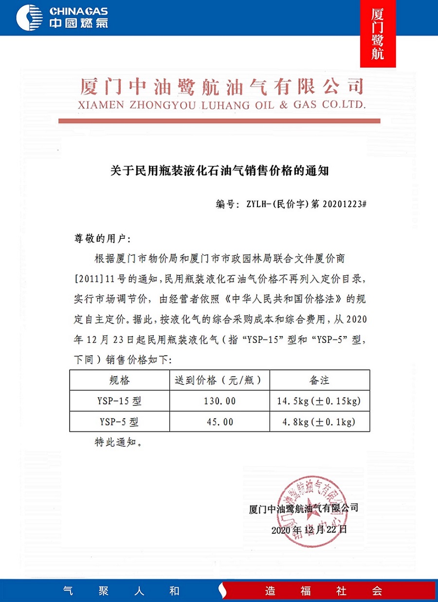 根据厦门市物价局和厦门市市政园林局联合文件厦价商[2011]11号的通知,民用瓶装液化石油气价格不再列入定价目录,实行市场调节价,由经营者依照《中华人民共和国价格法》的规定自主定价。据此,按液化气的综合采购成本和综合费用,从2020年12月23日起民用瓶装液化气(指“YSP-15”型和“YSP-5”型,下同)销售价格如下: